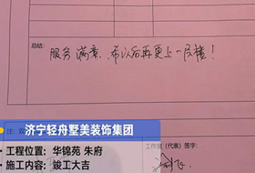 貴府的工程已全部圓滿竣工并通過(guò)了竣工驗(yàn)收,感謝您在整個(gè)過(guò)程中對(duì)于我們的理解、支持和包容。輕舟美住裝飾張興魯工作室提前恭賀您和家人喬遷新居,恭祝您和家人生活幸福美滿、事業(yè)蒸蒸日上。
